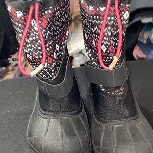 COLUMBIA GIRLS SIZE 2 SNOWBOOTS ALL WEATHER BOOTS BLACK w/BLACK PINK GEO DESIGN. VERY GOOD CLEAN CONDITION DRAWSTRING TOP CLOSE