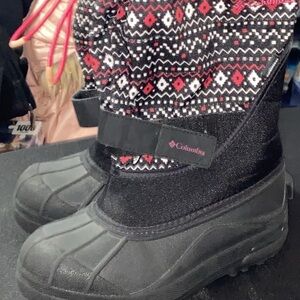 COLUMBIA GIRLS SIZE 2 SNOWBOOTS ALL WEATHER BOOTS BLACK w/BLACK PINK GEO DESIGN