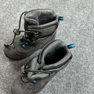 COLUMBIA Kids Insulated Bugaboot Winter Snow Boots black/blue size: 1 Omni-Heat Great used condition- see pictures for condition and wear Could use a good cleaning Toggle drawstring laces