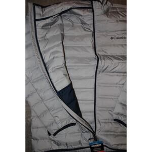 This is a Men's Columbia Heritage Peak 650 goose Down Jacket in size XL, featuring a Columbia gray- collegiate navy color scheme. The jacket is made of nylon with polyester lining, providing insulation and water resistance for fall and winter seasons. It has a quilted design with a zip closure and Columbia logo accents, making it suitable for travel, casual wear, and workwear. The jacket is lightweight and has a regular fit, perfect for outdoor activities with its down insulation and heat-seal construction.