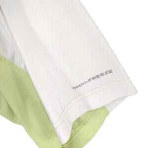 -Features: Collared neckline with 1/4 zip, omni-freeze accelerated cooling and wicking, back vent with mesh, stretch fabric, short raglan sleeves in white, light yellow-green shade