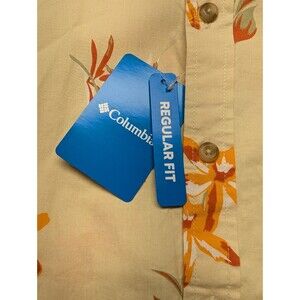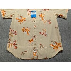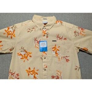 The COLUMBIA Rapid Rivers Button Up Shirt in medium green with short sleeves is a versatile and stylish addition to any man's wardrobe. Made from a comfortable blend of spandex and cotton, this shirt features a collared neckline and button-down closure. Perfect for various occasions including travel, casual outings, formal events, workwear, and business meetings, this shirt is machine washable and suitable for all seasons. The shirt's colorful, outdoor-themed design with floral accents adds a classic touch to any outfit, making it a great choice for cruise wear.