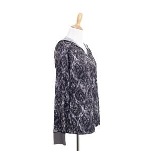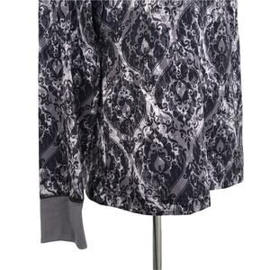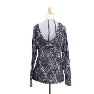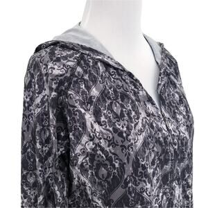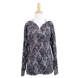 Super-lightweight Omni-Shade quarter-zip top in an antique ornate gray pattern. Technical material that reminds me of a windbreaker. Has a hood and a large kangaroo pocket.