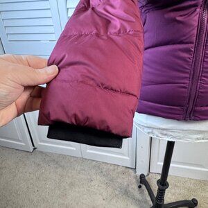 Maroon, zip up and hook and loop closure, removable hood, zip pockets, high neck zip up and snap, pit to pit 21”, length 26.5”