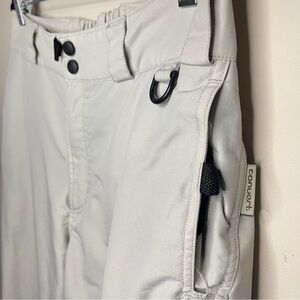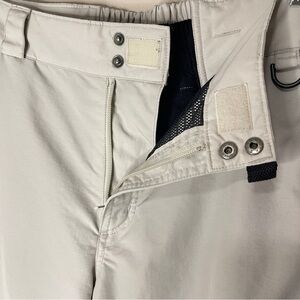 Women’ Beige/Tan snowboarding or ski pant featuring a zipper fly with double snap closure, elastic waistband with belt loops, hip slant pockets and additional zippered leg pockets.