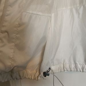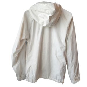 Columbia cream all weather hooded Arcadia II rain jacket. Style #3293. Adjustable storm hood. Drawcord adjustable hem. Zippered hand pockets. Packable. Mesh lining. Minor blue stain on right cuff area as pictured. Gently worn in good condition from non-smoking home. Chest approximately 22 inches laying flat pit to pit. Freshly laundered.