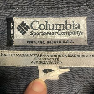 Men’s Columbia GRT short sleeve shirt size L. 52% viscose 48% polyester, good condition aside from two microscopic holes on the back (bottom left) reflected in price. Easy to repair if you wish, even easier to leave ‘em alone they’re so small 😝