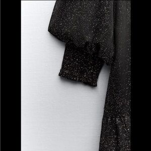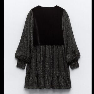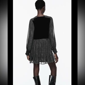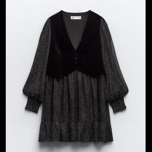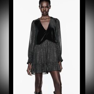 NWT. Never worn. Brand new condition. V-neck dress with long sleeves and elastic cuffs. Metallic thread detail and vest in combination velvet fabric. Interior lining. Flounced hem. Front buttons. Please review pictures.