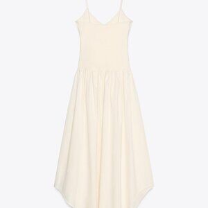 Midi dress with a round neckline and thin straps. Featuring tonal fabric combination detail and a cut-out on the front. Rounded hem.