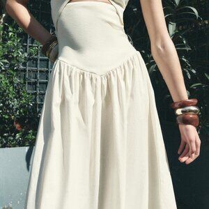 Midi dress with a round neckline and thin straps. Featuring tonal fabric combination detail and a cut-out on the front. Rounded hem.