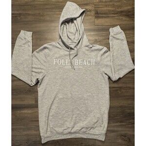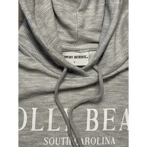 The Comfort Authentic Hooded Sweatshirt is a unisex size L sweatshirt with a unique waffled pattern. It features a gray color with a graphic print of Folly Beach SC, making it perfect for those who love a relaxed beach style. This pullover sweatshirt includes a hood, pockets, and is ideal for both men and women looking for a comfortable and casual activewear piece.