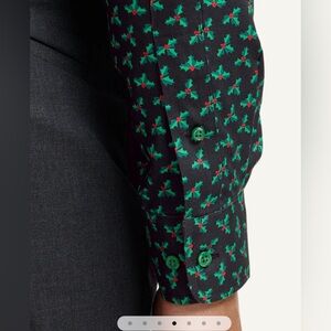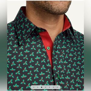 Chic black shirt with green geometric design. Red inner collar detail. Ideal for stylish outings.