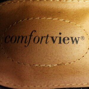 THESE HANDSOME DARK-BLUE LOW-HEEL ANKLE BOOTS BY COMFORT VIEW, SIZE 10M, MODEL NAME DARCY, are gently pre-owned, in excellent or better condition. The soles and heel tops have slight wear (pictures #15 & 16), but they are otherwise free of defects, damage, or signs of wear. The insoles are lightly cushioned. They lace up in front. The uppers have the look of fine-grain leather, but all materials are synthetic. The stated size is 10M, but prospective buyers are encouraged to compare the measurements with those of boots or shoes that they know fit well prior to purchase. Inside measurements are: length, heel to toe 10.5"; widest point 3 1/8"; narrowest point 1 7/8". Heel height is 1", boot height 5.5". (As is usually the case with boots, it's impossible to get down inside with a tape measure, so inside measurements are my best estimates based on outside dimensions.)