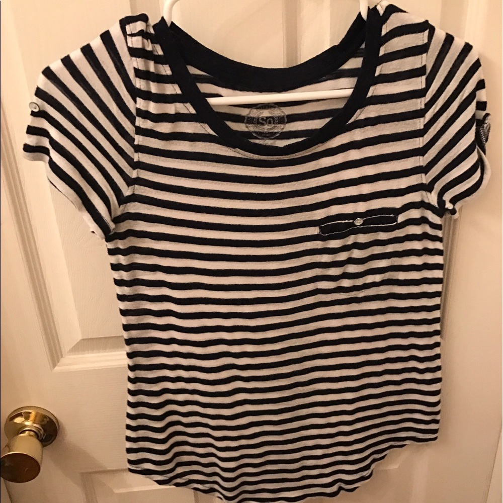 This striped top is cute and adorable and goes great with brightly colored or white bottoms! It is a very dark blue, not black.