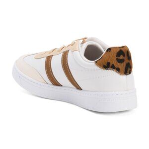 textured heel cap, leopard print detail, brand logo accents, comfort footbed, slip resistant sole, contrast trim