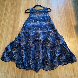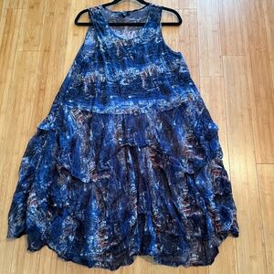 This Comfy USA sleeveless, mesh dress has a drop waist, scoop neck with a handkerchief hemline. Great travel dress, dries very quickly and lightweight. I wore this dress with leggings and a tank top for casual and also does well dressed up with a slip. Great swing to this dress with sass. Out of stock, company no longer in business.