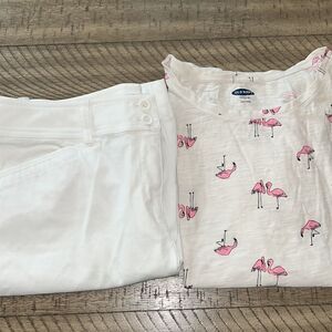 Sunshine fun 🤩 ☀️ Great outfit cleaned, sanitized, sealed and ready to jet ✈️ to the islands🏝️ 🏝️ cruise 🚢 or 🏙️ see pictures for measurements. Flamingo short is size large, cotton and a bonus Tee Shirt 👚