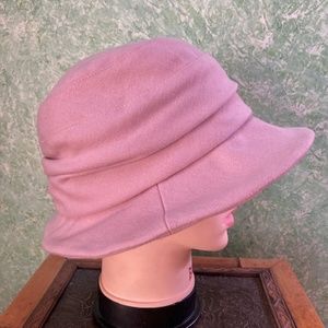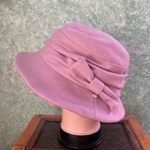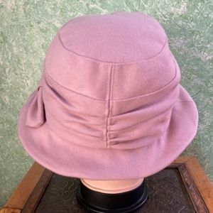 COMHATS woman’s pink lined hat with bow, adjustable pull string inside hat band, polyester fabric, excellent pre-owned condition #6839