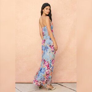 Floral print strapless maxi dress featuring a ruffled side slit and hem. Model is 5'9" and wearing size Small. - Elastic band with gel grip tape on the neckline - Pull on design - Some stretch from the bias cut - Ruffled side slit and hem - Lined Shell: 100% Polyester Lining: 95% Polyester, 5% Spandex