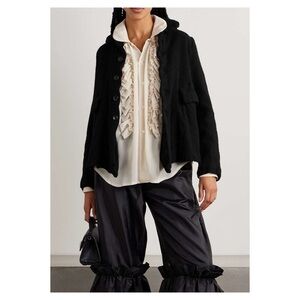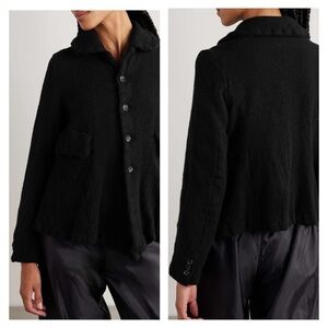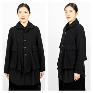 -details: Comme Des Garçons Comme Des Garçons a-line wool jacket in black. Notched collar with button front fastening, dropped shoulder, long sleeve with button cuff. A-line jacket with front flap pockets. Fully lined.