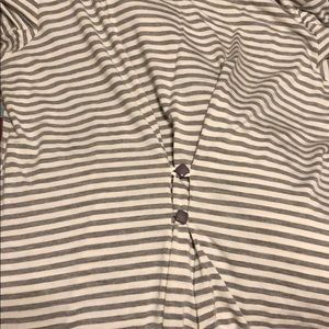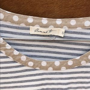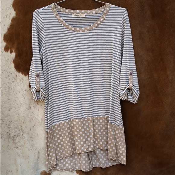 Blue striped blouse with white polka dots on the bottom. Very cute. 2 cute buttons on the back. 95% rayon.