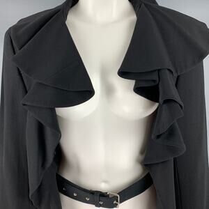 Vintage 1980s COMME des GARCONS jacket in a black wool fabric featuring an open front, ruffle collar, and belt closure. Made in Japan.