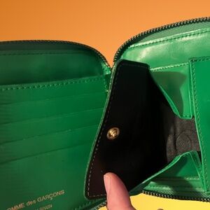 🔹 Authentic pre-owned COMME des GARÇONS zip-around wallet in clover-embossed green leather. Clean, classic design that’s compact but roomy enough for daily use.