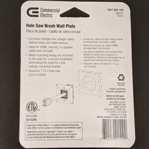 The Commercial Electric Hole Saw Brush Wall Plate is used to install low voltage cables behind smaller home theater and security equipment.