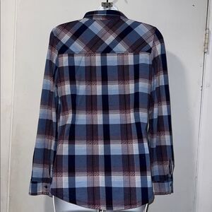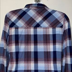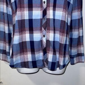Polyester spandex blend for a lightweight soft feel with slight stretch, navy, light blue and purple plaid pattern, flap and button pocket on each chest, button up closure, foldover collar and button cuffs. Excellent condition. Machine washable. Size small, measures 19” from armpit to armpit and 26” from top of shoulder to bottom hem.