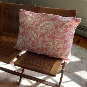 Quilted standard pillowcase sham. Zipper closure. Cream with a pink pattern on one side. Pink with cream pattern on the flip side.