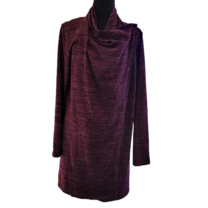 Company Ellen Tracy knit cardigan. Heathered purple poly rayon spandex knit. Single hook at each shoulder to create a cowl neck. 24.5" sleeve length. Measures flat 22" underarm seam to seam. 36" length. Size L EUC