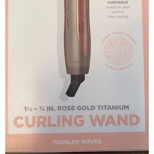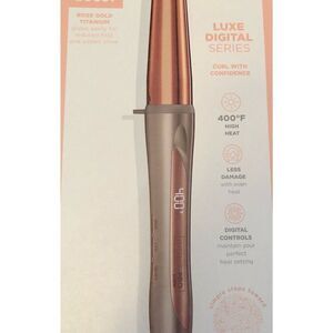 CONAIR Rose Gold Infinite Pro Titanium Curling Iron (professional and digital). This product is shine enhancing and can accommodate curls from 1.25" to .75". There are 30 heat settings and a fast, consistent heat. It heats up in 30 seconds up to 400°. It's 13" long with a cool tip and auto off. For that beachy look, leave the last inch of hair out of the curling iron. Beautiful styling tool and great gift. And it's NWT!