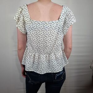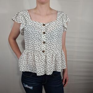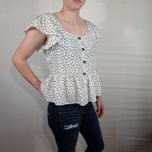 CONFETTI HEART PRINT RUFFLE HEM BLOUSE