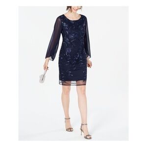 CONNECTED APPAREL Womens Navy Sequined Floral Long Sleeve Scoop Neck Dress