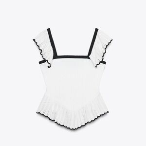 Top made in a knit fabric. Straight neckline and straps with ruffles. Contrast trims.