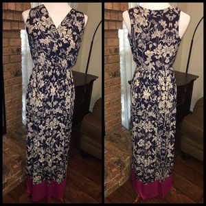 ๐บThis BEAUTIFUL Floral Maxi๐บ features a surplice front (faux wrap), it's sleeveless and slightly gathered at the waist. Colors are cream and navy with a contrasting band on the bottom in fuchsia. Material is 95% polyester 5% spandex. Super soft and comfy yet stylish! Made in the USA ๐บ๐ธ ๐บBUNDLE & SAVE๐บ
