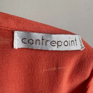 Details: Contrepoint "McBling", 2000's clubwear, salmon chiffon mini-tunic with metal beading embellishment at the neckline, 3 hook and eye closures down the front of the chest, and a drawstring drop waist. Slightly shear, with an additional layer of fabric at the front of chest and skirt.