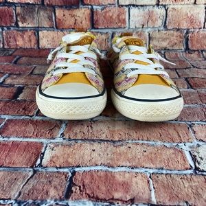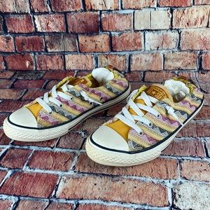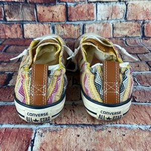 SELLING A GREAT PAIR OF WOMANS SIZE 7, CONVERSE ALL-STAR CHUCK TAYLOR SCINCH BACK LOWTOP SHOES, THE COLORS ARE YELLOW, PURPLE AND DARK GREEN STRIPE MULTI PRINT CANVAS UPPERS WITH WHITE SOLES STRETCHY SCINCH BACK EASY ON OR OFF WITH WHITE LACES, THE CONDITION IS EXCELLENT USED WITH ONLY MINIMAL WEAR AS SHOWN IN PICTURES, PLEASE FORWARD ANY QUESTIONS YOU MAY HAVE, BUNDLE UP AND SAVE OR REASONABLE OFFERS ALWAYS CONSIDERED THANKS FOR SHOPPING MY CLOSET AND HAVE A GREAT DAY ๐ ๐
