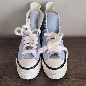 Light blue with floral accents, white platform soles