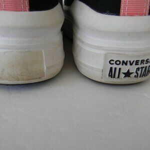 CONVERSE CHUCK TAYLOR ALL STAR BLACK/WHITE PINK STRIPE PLATFORM HIGH TOPS SZ 5. CUTE BLACK CANVAS WITH BACK PINK STRIPE AND PINK CAPS ON SHOE LACES. SELLING AS IS, OUTER BLACK CANVAS AND LACES ARE IN GOOD SHAPE, WHITE PLATFORM SHOWS SOME DIRT AS SHOWN, ONE OF THE BACK CONVERSE ALL STAR HAS COME OFF.