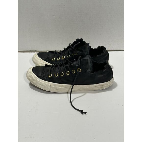 CONVERSE CT All Star Ox Womens Sz 7 Frilly Thrills Black Leather Scalloped Shoes. Used but still In good condition. The shoe laces are old and could be changed but can still be used this way. Pls check pictures for details on condition