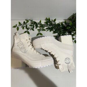 Stylish platform boots offering a blend of classic Converse design and contemporary flair. Durable textile upper with embroidered details enhances visual appeal.