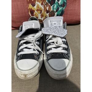 CONVERSE Chuck Taylor All Star Dbl Tongue OX Black Polka Dot Size 7. Preowned condition, looks like they have some specks of bleach maybe? See photos for condition and visual description. May need to be cleaned to your preference. Will come as is as shown. If you have any questions please ask 😊