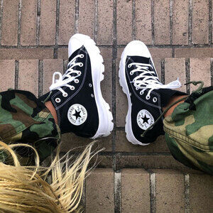 This canvas high-top shoe features the classic rubber toe cap, reinforced metal eyelets and the classic All Star patch on the inner ankles. Coming in a sleek black colorway with white platform soles and a chunky, lugged tread pattern, these fashion-forward shoes are sure to upgrade your outfits.