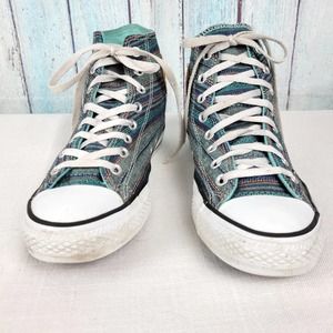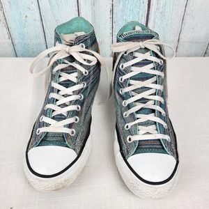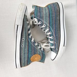 Horizontal Striped Peacock Acorn High-top All Star Sneakers by CONVERSE with Seafoam green lining. Suede leather heel vertical stripe and logo.