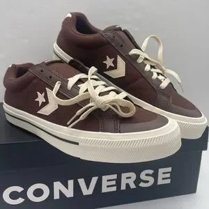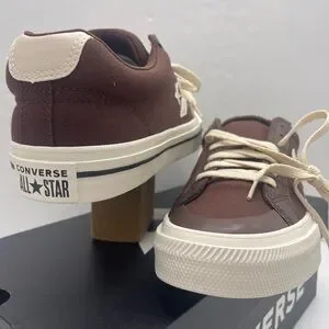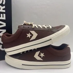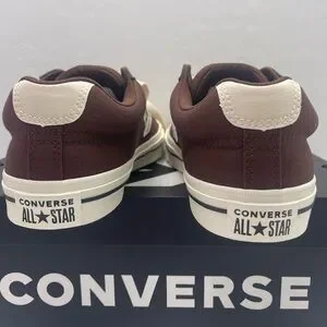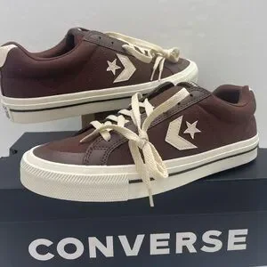 Chocolate Converse sneakers with cream star logo. Classic lace-up style.