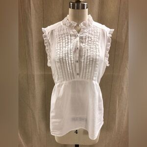 Chic white blouse with ruffle accents. Sleeveless design. Ideal for a stylish outfit.