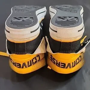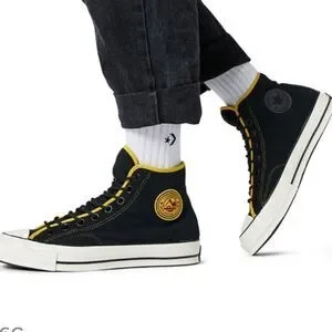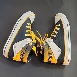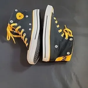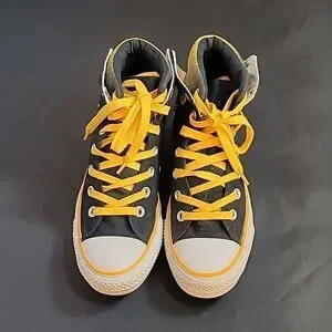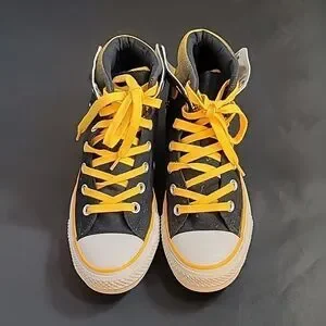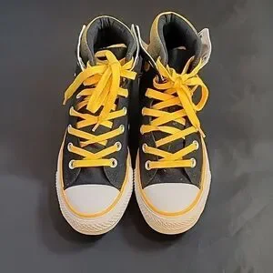 CONVERSE HIGH TOP LACE UP CLOSURE ROUND TOE UNISEX SNEAKER COLOR YELLOW, WHITE &BLACK MEN SIZE 5 WOMEN"S SIZE 7 MADE UPPER TEXTILE LINING TEXTILE OUTSOLE RUBBER THIS ITEMS IS PRE-OWNED EXCELLENT CONDITION WITH ONLY LIGHT SIGNS OF WEAR IF ANY CHECK THE PICTURES