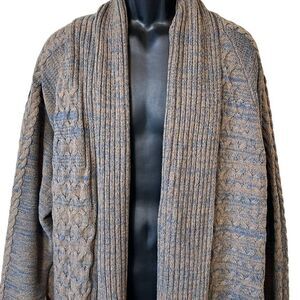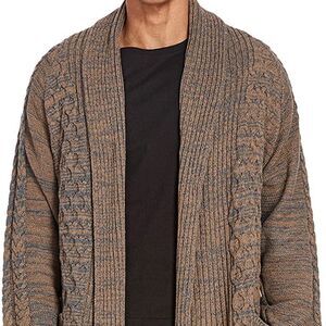 Slim fit, open front, long sleeves with ribbed cuffs, shawl collar, two front waist patch pockets, chunky knitted, solid color, heavy weight.