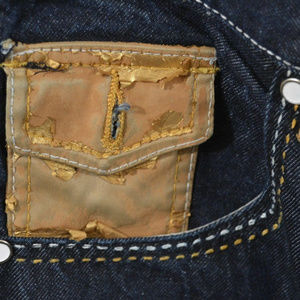 No holes or tears. Gold coming off of front pocket. In great shape. Back pocket has worn paint. Belt loops are gold and show some wear.